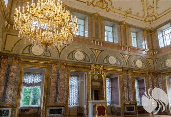 宫殿的内部装饰着使用稀有且昂贵的宝石——玛瑙装饰。所有这些豪华设计旨在强调其主人格里高里·奥尔洛夫的力量和阳刚之气。