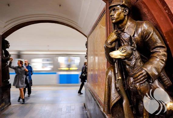 雕塑的是以十月革命胜利和苏联红军反法西斯战争为主题。冲锋陷阵的苏联红军、站岗值勤的哨兵,一个个鲜活的面孔早已定格在激情澎湃的历史年代。这里有着莫斯科地铁最有名的标志:幸福狗!传说你只要摸摸“边防军人和犬”雕像的青铜狗的鼻子,好运就会降临。于是,就像你能猜到的那样,这位人类的好朋友的鼻子已经被摸得非常光亮了。