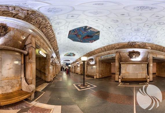 车站更像是一座地下宫殿,以“斯大林主义新古典主义”风格装饰,但并非没有前卫的装饰元素,它的特点是优雅,自由和宽敞的空间。天花板拱顶上带有灯的壁装饰有马赛克面板,主题为“苏维埃天空的一天”,但要看到它们,您需要直接站在壁iche下方,抬起头来。