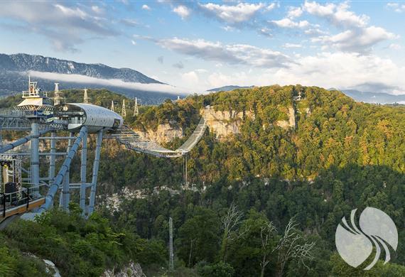 地球上最长的人行悬索天桥之一(439 m),遍布Mzymta河。从高处(207 m),可以欣赏到雄伟的高加索山脉和风景如画的黑海海岸的壮丽景色。天桥满足最高的安全要求,它可以承受住地震、大风大雨、下雪所带来的影响。