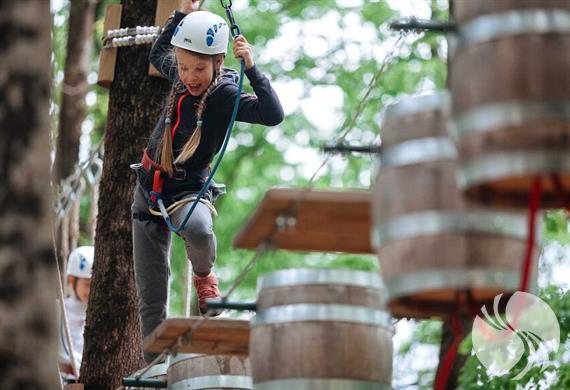 绳索公园内树木之间铺设了各种路线,为成年人和儿童设置了障碍,父母与孩子相互通过障碍,抵达终点。