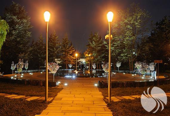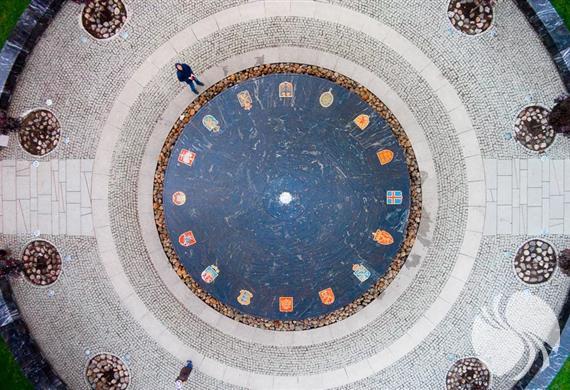 它以圆圈的形式制成,象征着谈判桌。沿其周边分布种植了16棵苹果树和喷泉池里16层用彩色马赛克制成的徽章-每个国家/地区都属于该组织。