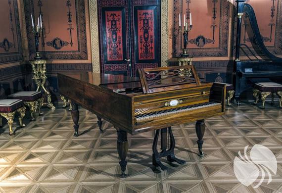 2楼的各个房间也得以修复并重现了当年的情形。这里的乐器都是很随意地摆放着的,这种展示方式很受欢迎。一间金色客厅是用于收集各种小提琴的,金色客厅本身也很别致,分别使用了金色浮雕与吊灯进行装饰。此外,还展示着拨弦古钢琴、古钢琴等,宫殿的室内装饰与优雅的古乐器相得益彰、相映成趣。