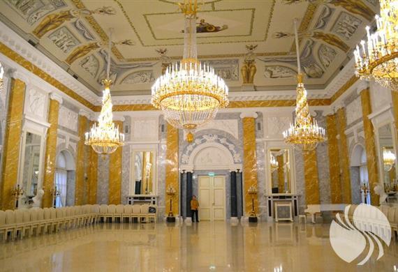 在这些大厅里,最难修复的是大理石厅。艺术研究家叶戈罗娃说:“所有的墙、柱、壁柱表面都用五个色调、深浅不一的仿大理石装饰。这些以石膏、大理石粉和颜料为材料的仿大理石,制作时要像俄罗斯古代那样,用腊对每一层进行手工抛光。这些仿大理石不仅制造工艺难度高,而且制造费用昂贵。”