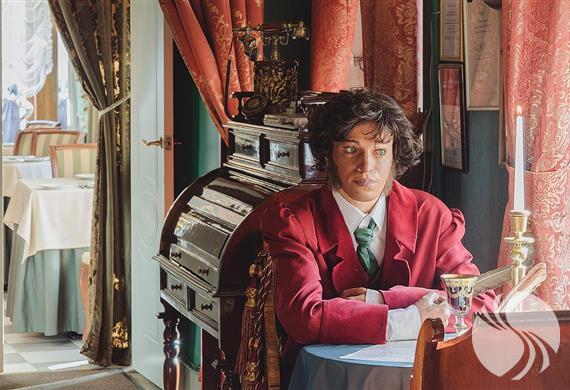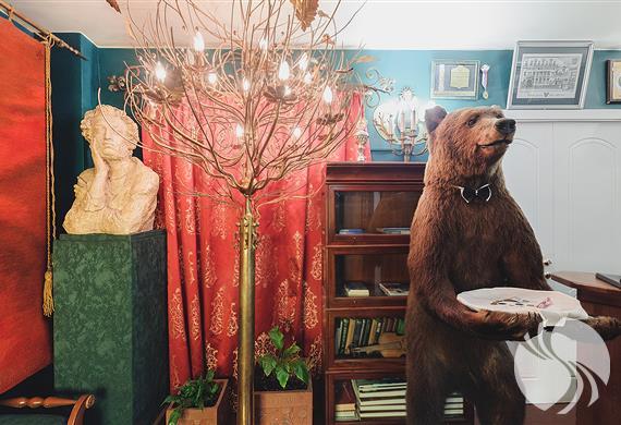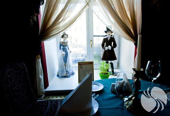 一楼右边窗口的桌子边,普希金的蜡像正静坐那里非常逼真。他凝视着窗外,桌旁放着他的黑色礼帽,他手执羽毛笔,正在构思新诗行。这里是普希金生前在店里最后坐过的位置,也成了普希金“永久”的位子。