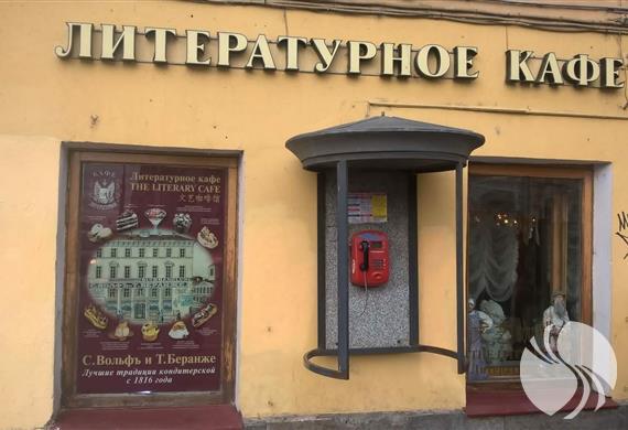“文学咖啡馆”位于涅瓦大街与大马尔斯卡亚街和莫伊卡沿岸街相交的地方。文学咖啡馆的前身为“沃尔弗和贝朗瑞糖果屋”,最初是由19世纪初的企业家沃尔弗和贝朗瑞建立,凭借杂志和报纸的力量,糖果点心屋很快闻名于圣彼得堡。到19世纪30年代,这里已成为一家文学名人聚会的“俱乐部”,普希金、莱蒙托夫、舍普琴科、尼古拉·车尔尼雪夫斯基等俄罗斯文学大师把这里当做休闲小憩的场所。
