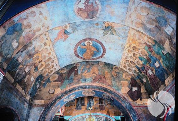 在教堂中央的天井穹顶,绘有水彩壁画《最后的审判》,壁画总面积约为300平方米,有一部分被保存了下来,被称为“俄罗斯建筑的杰出创造”,其曾是俄罗斯大教堂中的最高地位,几乎所有的重要仪式,包括大公的登基仪式、沙皇的加冕典礼等都在此举行。教堂里面安葬着12~13世纪弗拉基米尔的大公和主教等。