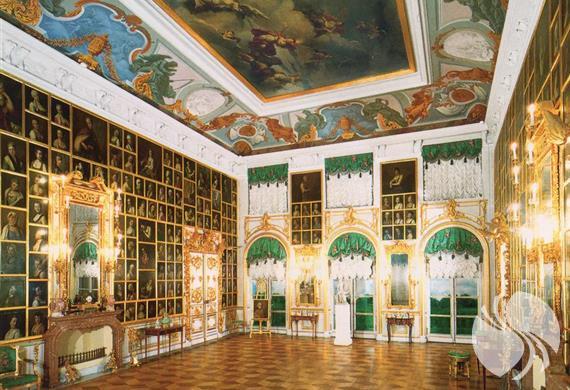 由瑞士人多梅尼克·特列吉尼设计,是历代俄国沙皇的郊外离宫,也是圣彼得堡的早期建筑。第二次世界大战中,它遭到德国军队的破坏。希特勒在其占领Astoria Hotel的计划失败后,打算在这里举行新年胜利庆祝会,此举激怒了苏联当局。在1941年12月至1942年1月期间,斯大林下令炸毁这座宫殿,以阻止德国人的庆祝活动。二战后经修复,被联合国教科文组织列为《世界遗产名录》。