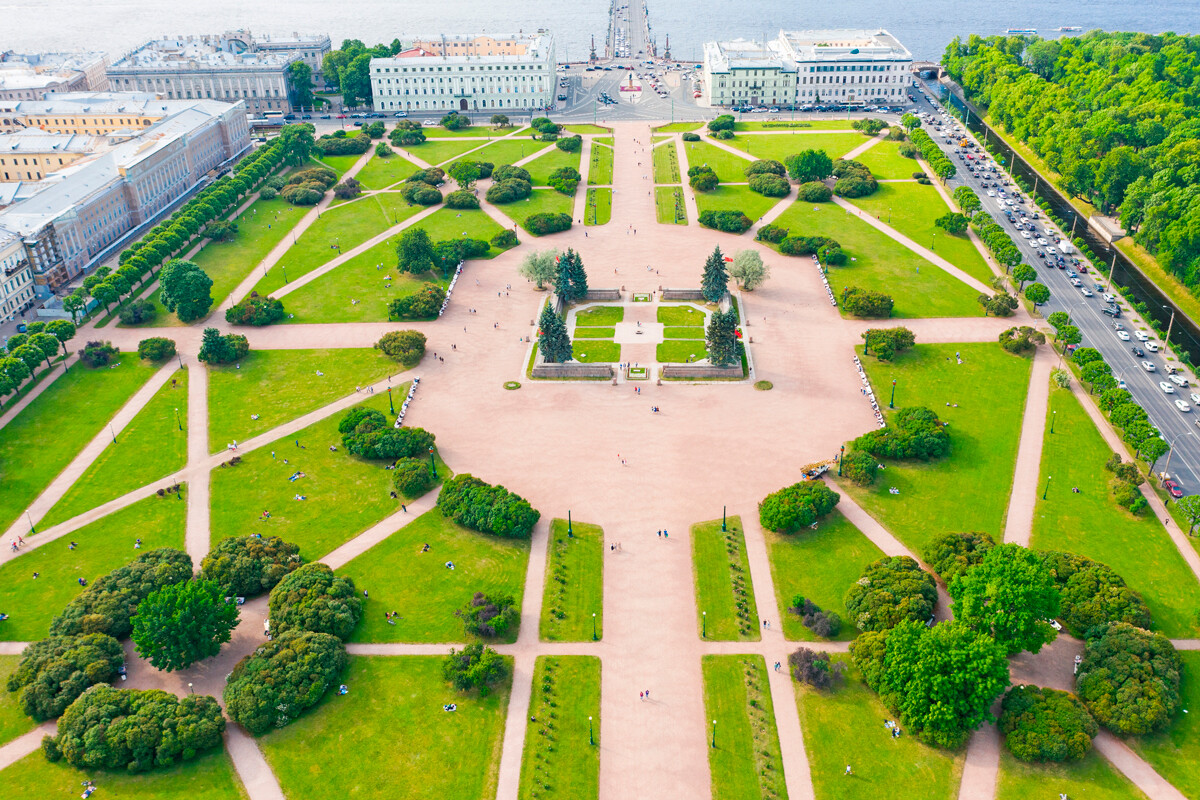 自彼得一世时期开始,这个大草地的地方就被用来阅兵,后面这里就开始举办体育节了,广场的名称为了纪念古代的罗马战神。1917年二月革命的遇难者的万人坑也是在这里。
