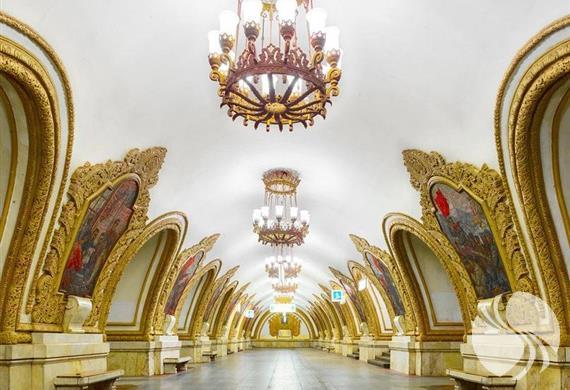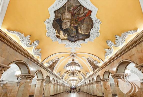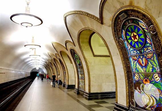 有观光客必访的共青团车站,里面金碧辉煌如同沙皇宫殿。它的设计主题是展示爱国史,激发人们对俄罗斯的未来充满向往。这个宏伟的地铁站是著名建筑师休谢夫为纪念苏联人民在伟大的卫国战争中取得的胜利而设计修建的。特别的塑像,植物装饰和雕花组成了八幅华美的马赛克雕画。地铁站的设计生动地描绘出了俄罗斯伟大军人的形象,表现了“胜利的凯旋”和“列宁在红场上演讲”的场景。