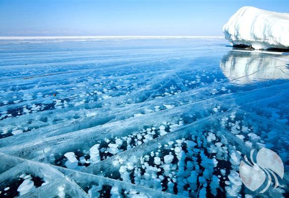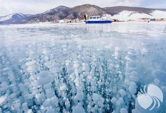 气泡冰是由于湖底中的有机物分解形成不溶于水的甲烷气体,一旦甲烷气体接近湖面将被冷冻,气泡就会留在水里,随着冰层加厚,从而呈现出如此壮观美丽的自然景象。每年的1月至5月是贝加尔湖的冰封期,湖面冰层最厚超过1米,在这个时期内,就可以看到贝加尔湖独特的气泡冰了。