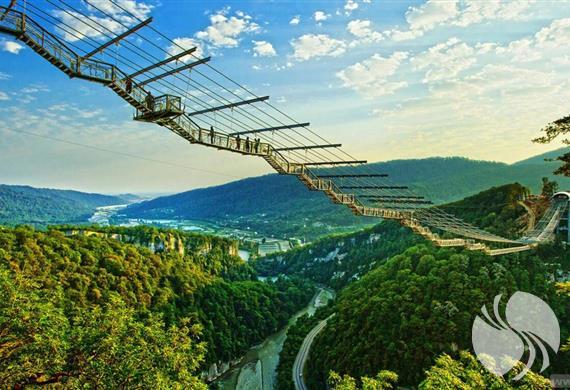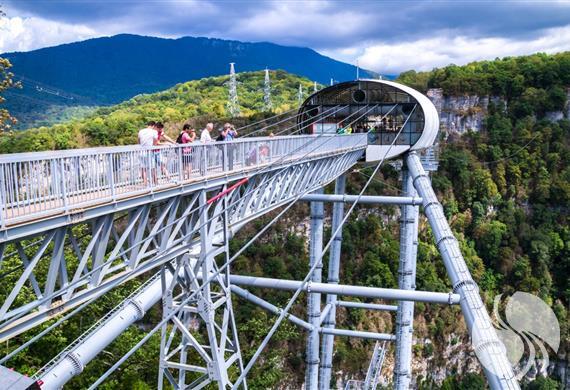 地球上最长的人行悬索天桥之一(439 m),遍布Mzymta河。从高处(207 m),可以欣赏到雄伟的高加索山脉和风景如画的黑海海岸的壮丽景色。天桥满足最高的安全要求,它可以承受住地震、大风大雨、下雪所带来的影响。