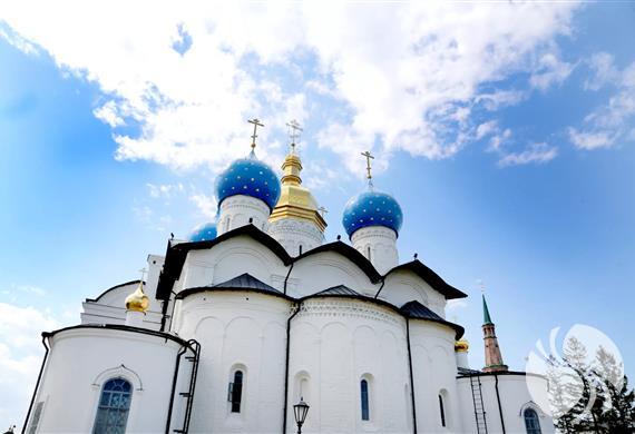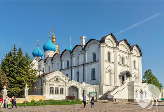 这座具有里程碑意义的天使般的白石大教堂最初以五穹顶,三尖顶,六英尺长的寺庙的形式建造。它是从伏尔加河对岸开采的伏尔加河石灰石建造的。寺庙的圆顶最初是头盔状的。 建造圣殿后,在其附近建造了一座木制钟楼。并且在17世纪上半叶,竖立了一座50米高的五层白砖钟楼,一下子就能让人联想起莫斯科伊凡大帝的钟楼,其高度略逊于喀山克林姆林宫斜塔。 1928年,由于意识形态原因,钟楼被摧毁。现在在钟楼的遗址上,有一个公共花园,2003年,由一群喀山雕刻家设计了纪念碑“喀山克里姆林宫的建筑师”。