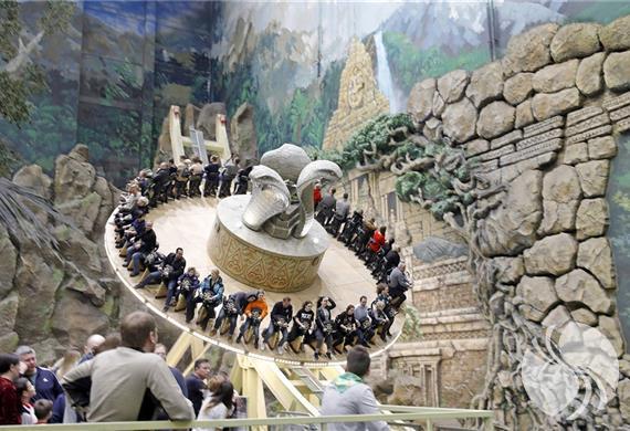 猴城(家庭游玩区):带有12个推车的旋转木马,每个推车有2个座位。还有猴子人民的国王Banderlog自豪地坐着,并与客人一起绕着轴旋转手推车。同时,它们每个都上升到9米的高度并下降。旋转木马的直径为15 m,该景点具有相对安静的速度模式:每分钟旋转10转。