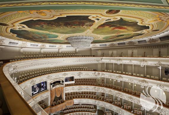 这栋古老建筑最初的设计图出自亚历山大·巴甫洛维奇·布留洛夫之手。1833年,剧院正式落成,剧院外观简洁,并无张扬。但走进剧场内,天鹅绒的观众椅,金碧辉煌的浮雕,水晶吊灯,彩绘壁画,古董镜子……处处彰显皇家奢华与典雅!